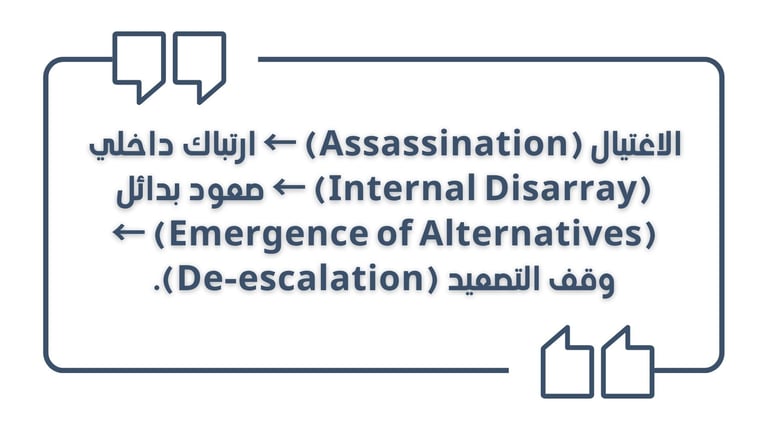 الاغتيال (Assassination) ← ارتباك داخلي (Internal Disarray) ← صعود بدائل (Emergence of Alternatives) ← وقف التصعيد (De-escalation).