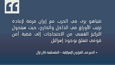 ويقول ناثان ثرال الخبير في الشؤون الإسرائيلية – الفلسطينية: "نتنياهو يرى في الحرب مع إيران فرصة لإعادة ترتيب الأوراق في الداخل والخارج، حيث سيتحول التركيز الشعبي من الاحتجاجات إلى قضية أمن قومي تتعلق بوجود إسرائيل".