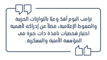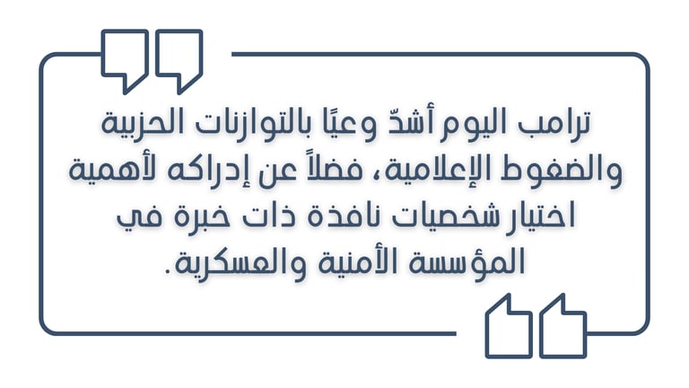 هذه “البراغماتية الصدامية” -إن جاز التعبير- قد تَظهر أكثر وضوحًا في الولاية الثانية؛ لأنّ ترامب اليوم أشدّ وعيًا بالتوازنات الحزبية والضغوط الإعلامية، فضلاً عن إدراكه لأهمية اختيار شخصيات نافذة ذات خبرة في المؤسسة الأمنية والعسكرية.