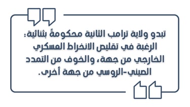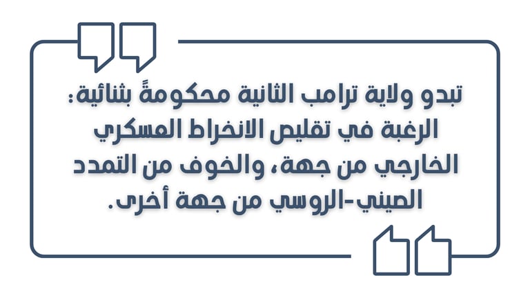 وعليه، تبدو ولاية ترامب الثانية محكومةً بثنائية: الرغبة في تقليص الانخراط العسكري الخارجي من جهة، والخوف من التمدد الصيني-الروسي من جهة أخرى. وفي ظلّ هذه الثنائية، سيحاول ترامب اللعب على أوتار التهديد بالعقوبات والضغط الاقتصادي، مع احتفاظه بهامش من المناورة الدبلوماسية إذا استدعى الأمر “تسويات سريعة” أو صفقات تجارية ذات منفعة مادية مباشرة.